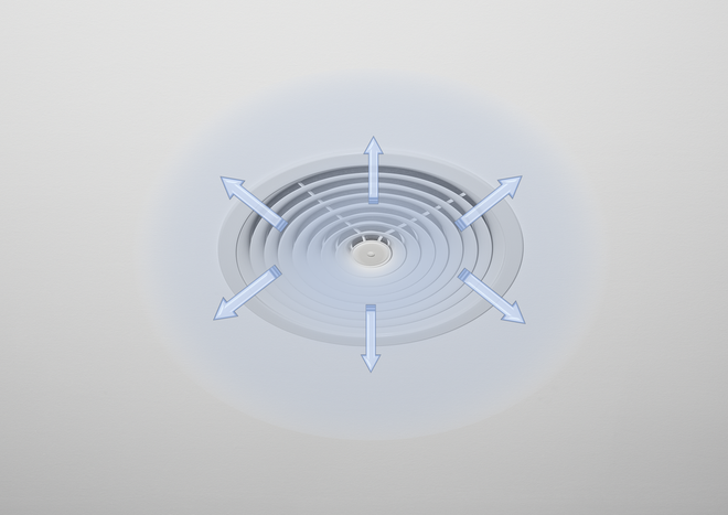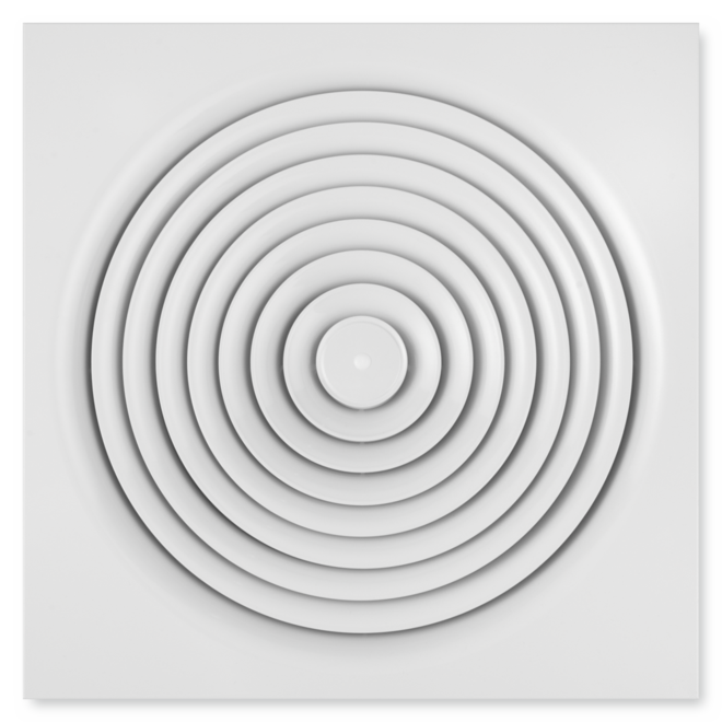 Ceiling diffusers direct the air from air conditioning systems into the room. The resulting airflow induces high levels of room air, thereby rapidly reducing the airflow velocity and the temperature difference between supply air and room air. Ceiling diffusers allow for large volume flow rates. The result is a mixed flow ventilation in comfort zones, with good overall room ventilation, creating only very little turbulence in the occupied zone.