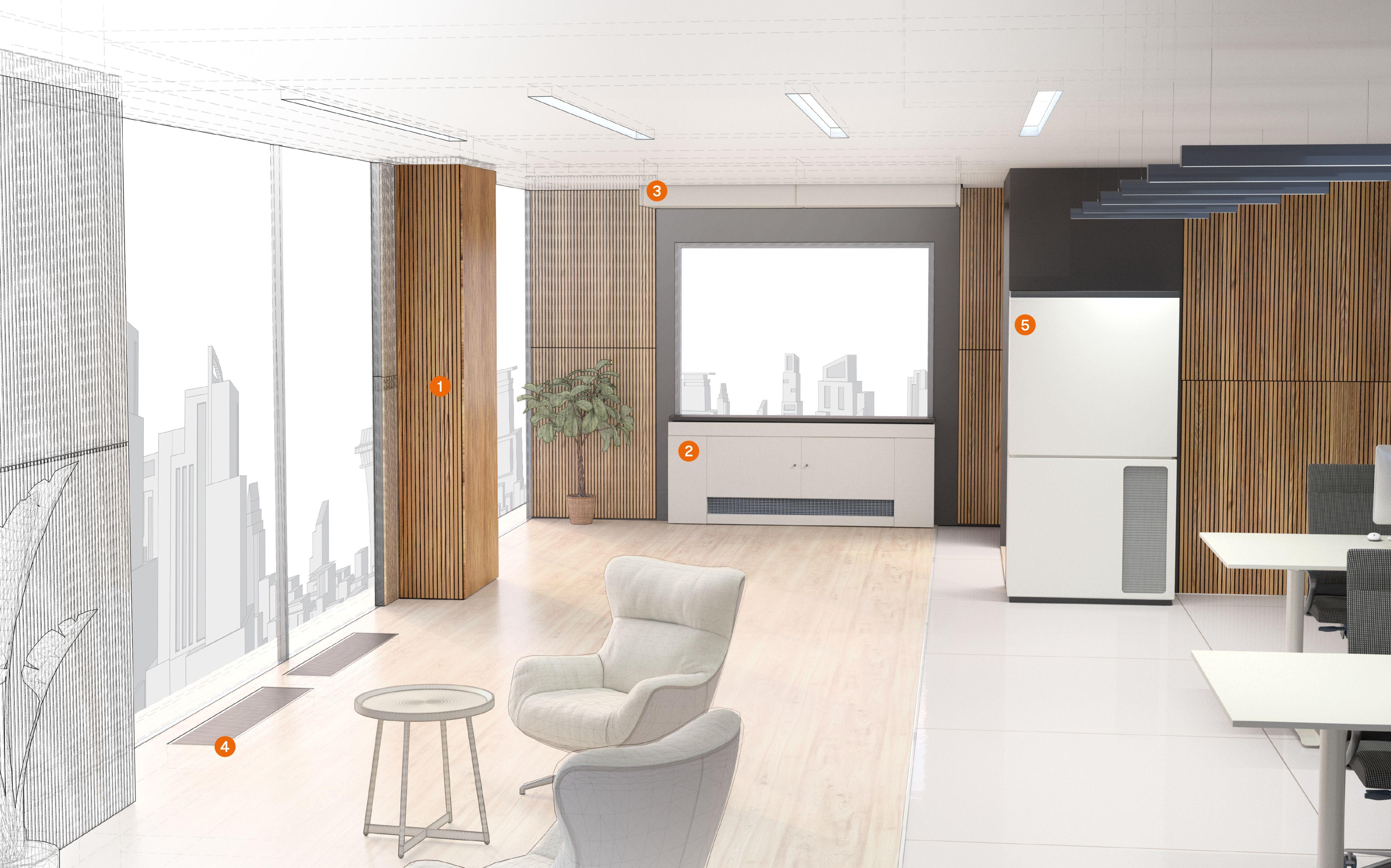 Dezentrale Lüftungssysteme sind seit vielen Jahren bewährt und bieten eine einfache Möglichkeit zur Erstausstattung oder Nachrüstung in Bürogebäuden und Bildungseinrichtungen. Da die Geräte direkt an oder in die Nähe der Fassade montiert werden, ist eine aufwändige Verlegung von Lüftungsleitungen nicht nötig.