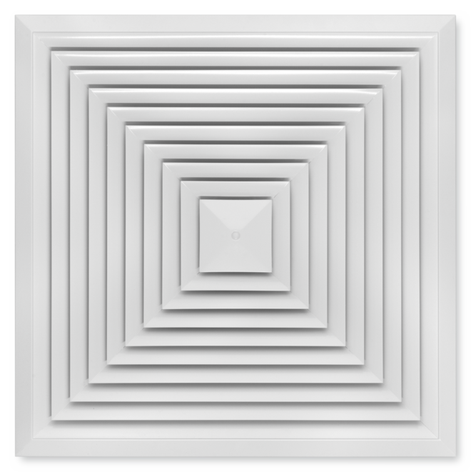 Ceiling diffusers with square diffuser face. Supply air and extract air variants for comfort zones. Diffuser face with fixed air control blades for horizontal four-way air discharge. For installation into all types of suspended ceilings.