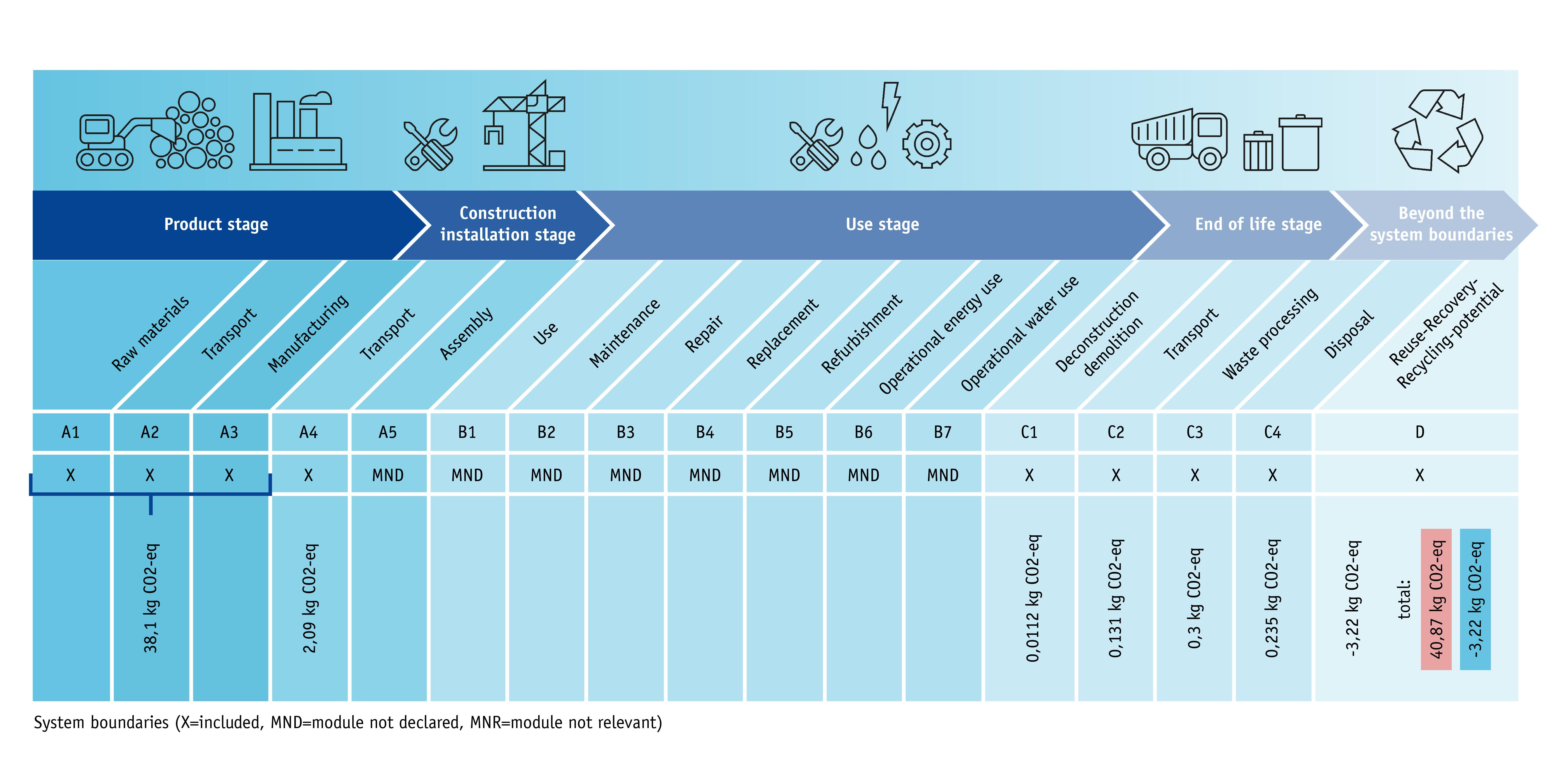 EPDs sind ein wichtiges Instrument zur Bilanzierung der Umweltauswirkungen eines Produktes auf Basis einer Lebenszyklusanalyse (Life Cycle Assesment - LCA). Die Verifizierung einer EPD erfolgt durch einen anerkannten Ökobilanzierer, damit die Berechnung auf einheitlichen Standards erfolgt und somit eine Vergleichbarkeit möglich wird. Dadurch entsteht eine Wettbewerbssituation, die Anreize zur Verbesserung des ökologischen Fußabdrucks von der Beschaffung bis zur Entsorgung eines Produktes erzeugt. Diese Tabelle zeigt am Beispiel eines Produktes alle Module, die in die Berechnung der EPD eingeflossen sind. (C02-eg ist hierbei nur eine exemplarische Einheit). Die Grundlage für die Berechnung der Umweltauswirkungen bilden Datenbanken wie ecoinvent oder Ökobaudat. Das Ergebnis basiert auf den bereitgestellten Datensätzen zu Materialien und deren Umweltfaktoren über den Produkt-Lebenszyklus. |