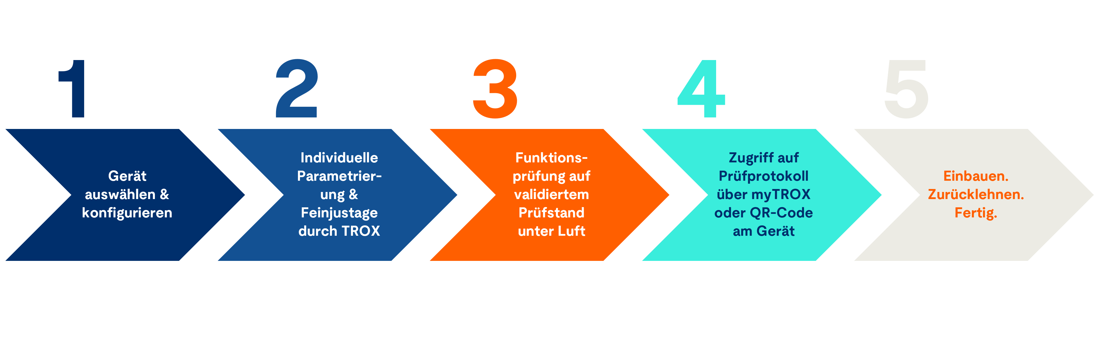 Mit den werkseitig geprüften variablen Volumenstromreglern von TROX sparen Sie Zeit, vermeiden Fehlerquellen und gewinnen Planungssicherheit. Jedes Gerät wird individuell parametriert, feinjustiert, auf einem validierten Prüfstand unter realen Bedingungen getestet und mit einem digitalen Prüfprotokoll dokumentiert – abrufbar über Ihren myTROX-Accout oder per QR-Code, direkt am Gerät. Das ist geprüfte Qualität, die auf der Baustelle sofort überzeugt.