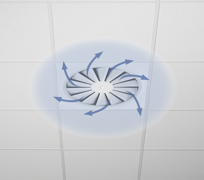 Ceiling swirl diffusers allow the supply air from ventilation systems to flow into the room in a swirl pattern. The resulting airflow induces high levels of room air, thereby rapidly reducing the airflow velocity and the temperature difference between supply air and room air. Ceiling swirl diffusers allow for large volume flow rates. The result is a mixed flow ventilation in comfort zones, with good overall room ventilation, creating only very little turbulence in the occupied zone.