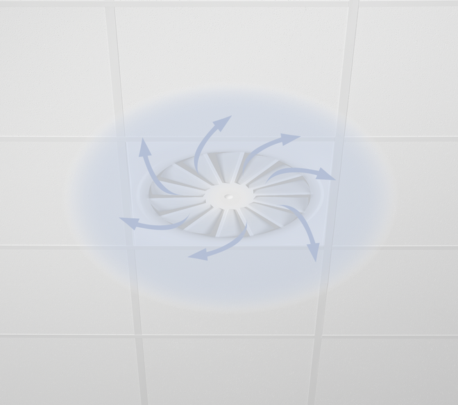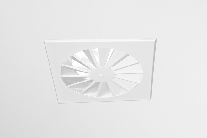 RFD-SIRIUS combines the functions of a volume flow controller, sound attenuator, plenum box and air terminal device in one unit. To determine the current actual volume flow rate, the differential pressure is measured using the integrated measuring tubes and transmitted to the controller. Depending on the desired setpoint value, the volume flow control unit is adjusted with an integrated linear actuator. The construction of the diffuser ensures that sound is effectively absorbed, which results in low sound power levels.