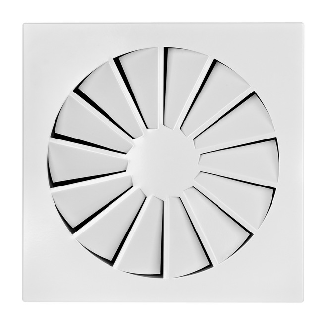 RFD-SIRIUS is an air terminal device combined with a VAV terminal unit. The ceiling diffuser with a square or circular diffuser face is preferably used as a supply air diffuser for comfort zones. The fixed air control blades allow for horizontal swirling supply air discharge creating high induction levels. The diffuser is suitable for installation into all types of suspended ceilings. The diffuser is fixed with a central fixing screw to the cross bar (no tools required); the cross bar is inserted into the SIRIUS plenum box (no tools required) and held in place with magnets. The SIRIUS plenum box is fitted with two spigots, one for connection to the ductwork and another one for connection of the diffuser face. The SIRIUS plenum box contains two cylinders, one fitted inside the other; one of the cylinders is perforated. The perforated cylinder is moved along a toothed bar upon control input from the volume flow controller, and the free area changes as a consequence. A fleece covering the perforated cylinder acts as an equalising element. This special construction feature allows for omitting any additional sound attenuator.