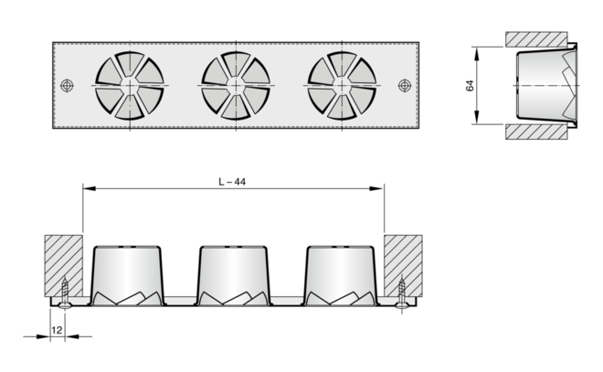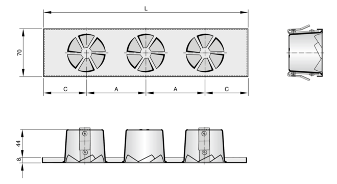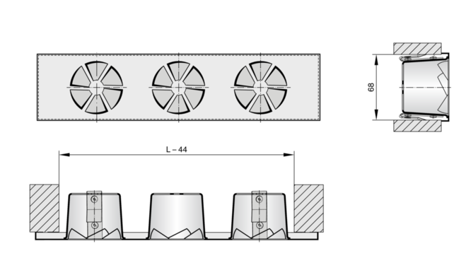 Ready-to-install component which consists of a diffuser face with up to six outlets. Each outlet with radially arranged fixed blades and a cup with damper element.