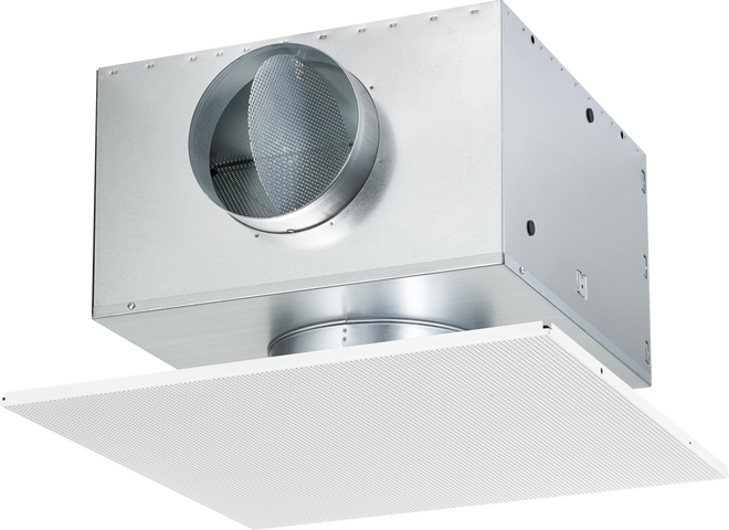Ceiling swirl diffusers allow the supply air from ventilation systems to flow into the room in a swirl pattern. The resulting airflow induces high levels of indoor air, thereby rapidly reducing the airflow velocity and the temperature difference between supply air and room air. Ceiling swirl diffusers enable large volume flow rates. The result is a mixed flow ventilation in comfort zones, with good overall indoor ventilation, creating only low turbulence in the occupied zone. TROX INVISIBLE DIFFUSER (TID) are characterised by their unobtrusive or inconspicuous installation. The swirl unit required for the swirling air discharge is not visible from the room. The special shape of the discharge nozzle allows the swirl effect to be used even behind standard perforated metal ceiling tiles or factory-made perforated metal sheet fronts. Type TID ceiling swirl diffusers have fixed air control blades. Air distribution is horizontal, with an omni-directional flow. The supply air to room air temperature difference may range from –12 to +10 K. A damper element in the plenum box simplifies volume flow rate balancing for commissioning. To give rooms an aesthetic, uniform look, Type TID diffusers may also be used for extract air.