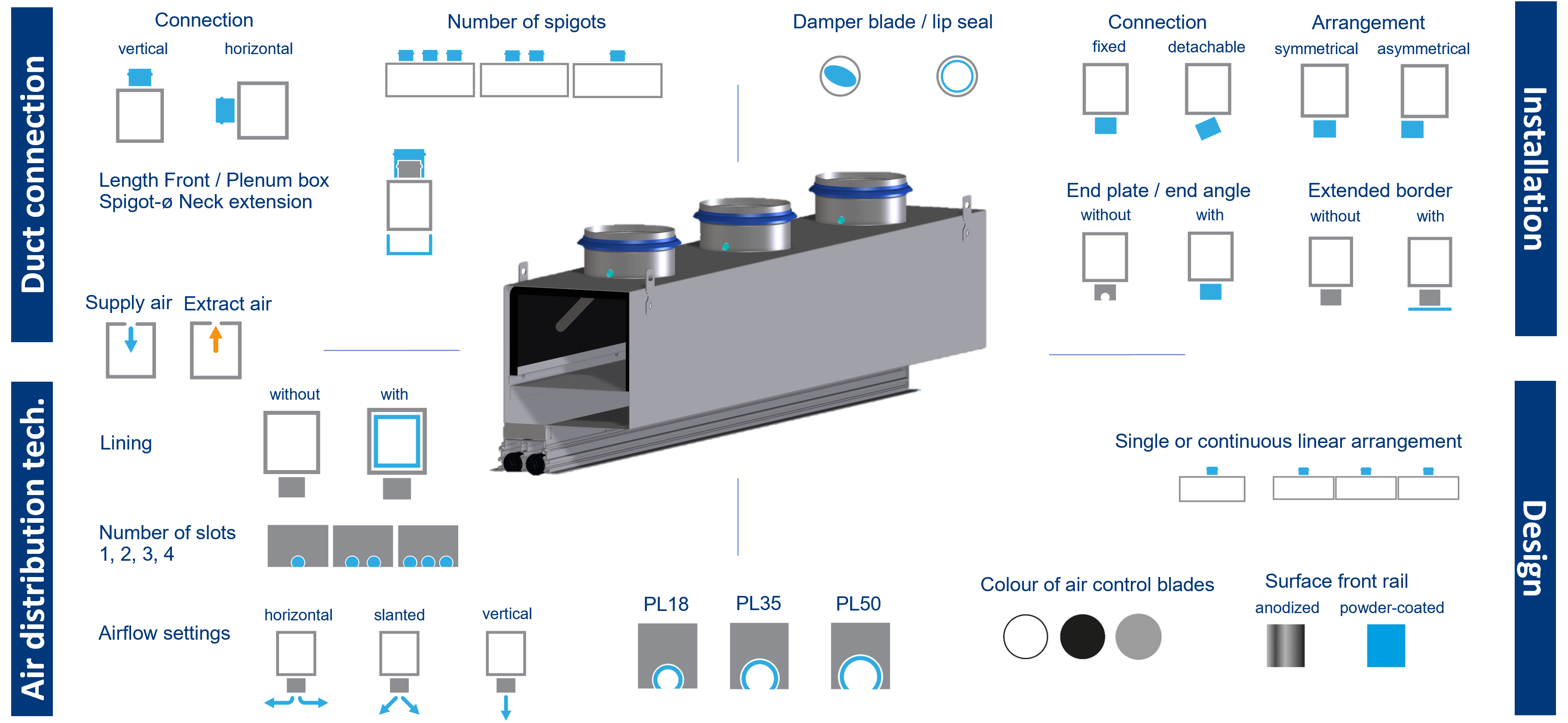 The example of our Pureline slot diffuser for the ceiling shows you the almost endless choices available when designing the right slot diffuser.