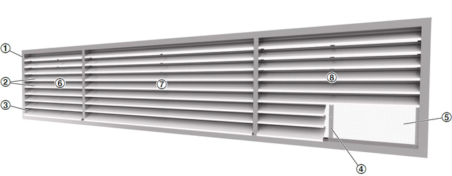 • Frontrahmen, Trennsteg und Lamellen aus profiliertem, verzinktem Stahlblech, Aluminium oder Edelstahl