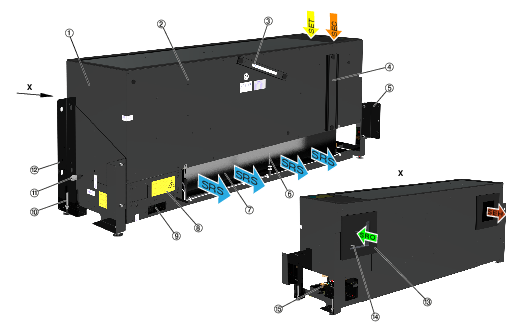 • Verbindung zur Außenluftansaugung bzw. Fortluftausblasung erfolgt über 2 kundenseitig, in der Fassade bzw. Außenwand vorgesehene Lüftungsöffnungen, empfohlenerweise mit Gefälle nach außen