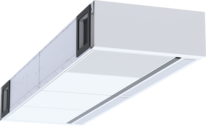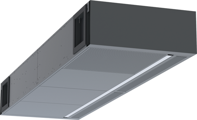 Deckenlüftungsgerät TROX X-CUBE/SCHOOLAIR-D-HV-0-2 mit Zu- und Abluftfunktion, Rotationswärmerückgewinner und Umschaltmöglichkeit auf Sekundärluftbetrieb (luftqualitätsabhängig) sowie Wärmeübertrager zum Einbau im Deckenbereich: