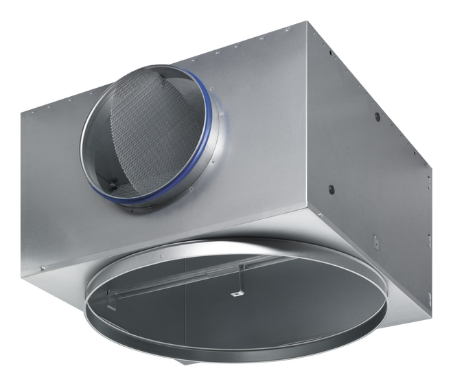 Plenum boxes are used to connect ceiling diffusers to circular ducts and to fix the diffuser face. Type AK-Uni plenum boxes are fitted with an equalising element that ensures that the air is evenly distributed to the room. A damper blade (optional) simplifies volume flow rate balancing for commissioning. Pressure tap and cord-operated damper blade (optional) allow for volume flow rate balancing with the diffuser face in place.