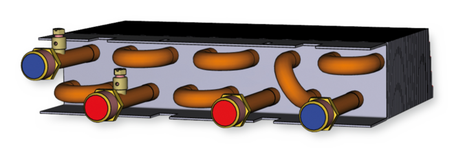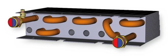 The primary air is discharged through nozzles (in 4 sizes) into the mixing chambers; as a result of this, secondary air is induced. Secondary air (room air) is induced via the induced air grille and passes through the horizontal heat exchanger, where it is heated or cooled.