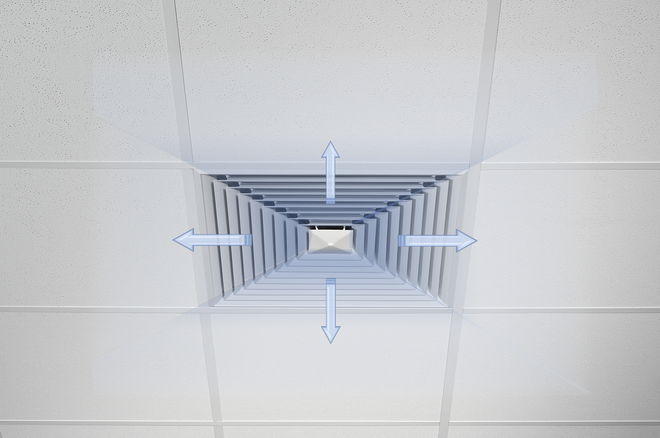 Ceiling diffusers direct the air from air conditioning systems into the room. The resulting airflow induces high levels of room air, thereby rapidly reducing the airflow velocity and the temperature difference between supply air and room air. Ceiling diffusers allow for large volume flow rates. The result is a mixed flow ventilation in comfort zones, with good overall room ventilation, creating only very little turbulence in the occupied zone.