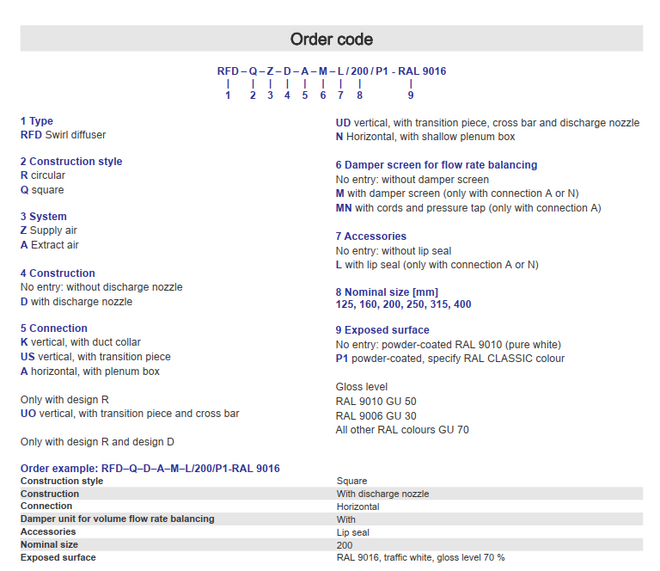 Type RFD ceiling swirl diffusers have fixed blades. Air discharge is horizontal with an omni-directional flow. The supply air to room air temperature difference may range from –12 to +10 K.