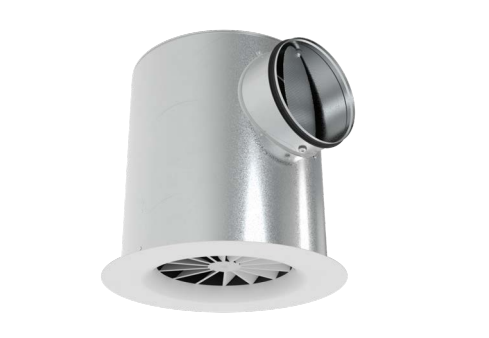 Swirl diffusers with circular diffuser face. Supply and extract air variants for comfort zones and industrial zones. Diffuser face with fixed control blades and variable internal geometry controlled via thermal actuator. In cooling supply air will discharge in a horizontal swirling pattern creating high induction levels. In heating supply air will switch to vertical discharge to penetrate into the occupied zone. For installation into all types of suspended ceilings and rooms without suspended ceilings. Ready-to-install component which consists of the diffuser face with radially arranged fixed air control blades and a plenum box with side entry, and suspension holes or suspension lugs. The diffuser face is fixed to the cross bar with a central screw. Thermal Actuator temperature range 18 °C to 32 °C. Spigot suitable for ducts to EN 1506 or EN 13180. Sound power level of the air-regenerated noise measured according to EN ISO 5135.