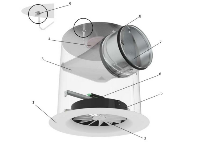 Ceiling diffusers direct the air from air conditioning systems into the room. The resulting airflow induces high levels of room air, thereby rapidly reducing the airflow velocity and the temperature difference between supply air and room air. Ceiling diffusers allow for large volume flow rates. The result is a mixed flow ventilation in comfort zones, with good overall room ventilation, creating only very little turbulence in the occupied zone. Type RFD-V ceiling diffusers have fixed blades and an adjustable internal sleeve, allowing for horizontal and vertical air discharge. During cooling air discharge is horizontal and radial, in heating air discharge is vertical. The internal sleeve is controlled with a thermal actuator. The supply air to room air temperature difference may range from -10 to +15K. To give rooms an aesthetic, uniform look, type RFD-V diffusers may also be used for extract air.