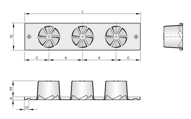 Ready-to-install component which consists of a diffuser face with up to six outlets. Each outlet with radially arranged fixed blades and a cup with damper element.