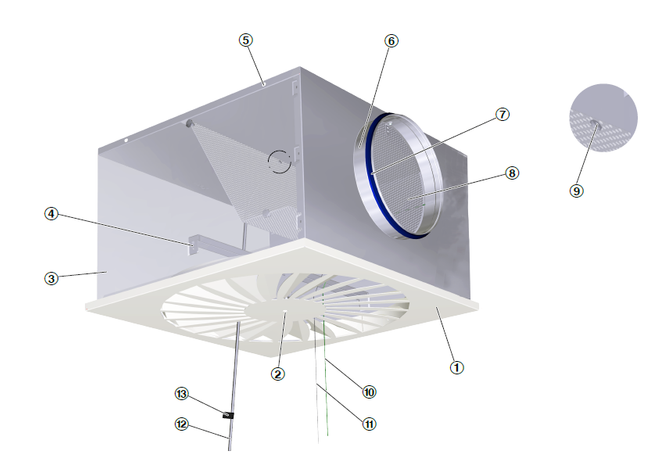 Ceiling swirl diffusers with square or circular diffuser face. Supply air and extract air variants for comfort zones. Diffuser face with fixed air control blades for horizontal swirling supply air discharge creating high induction levels. For installation in suspended ceilings of all kinds. Ready-to-install component which consists of the diffuser face and a plenum box, side entry or top entry spigot, and suspension holes or suspension brackets.