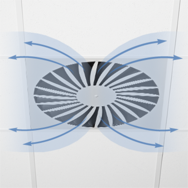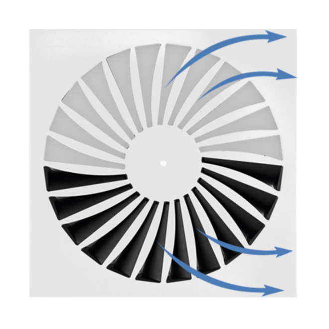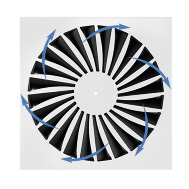 Ceiling swirl diffusers with square or circular diffuser face. Supply air and extract air variants for comfort zones. Diffuser face with individually manually adjustable air control blades for horizontal swirling supply air discharge creating high induction levels. For installation into all types of suspended ceilings.