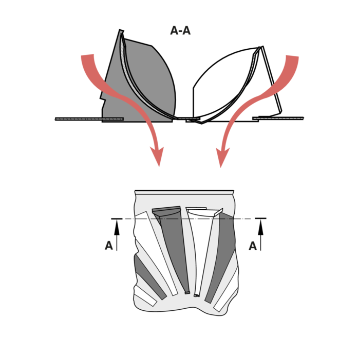 Type TDV ceiling swirl diffusers have adjustable air control blades. The air pattern can be adjusted to meet different local requirements. Horizontal air discharge is one-way, two-way or omni directional. Vertical air discharge is possible but only for heating. The supply air to room air temperature difference may range from –12 to +10 K.