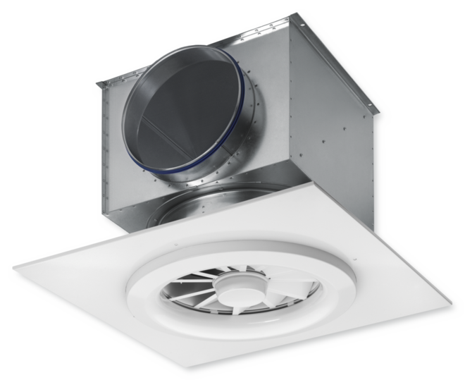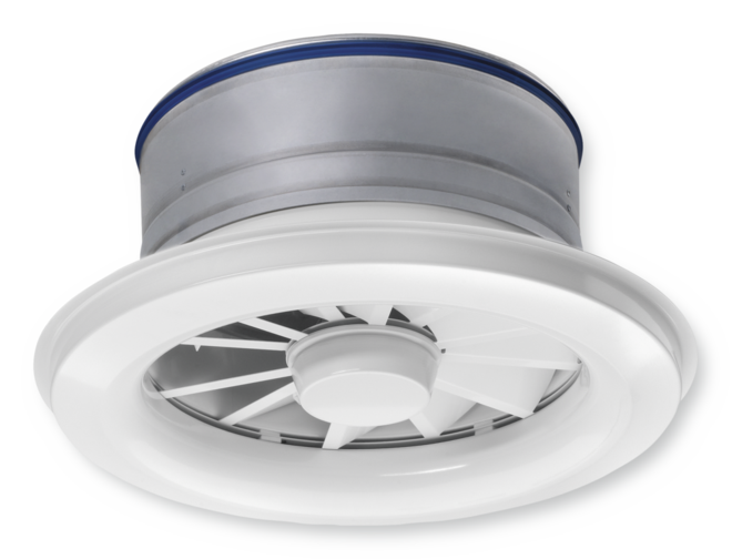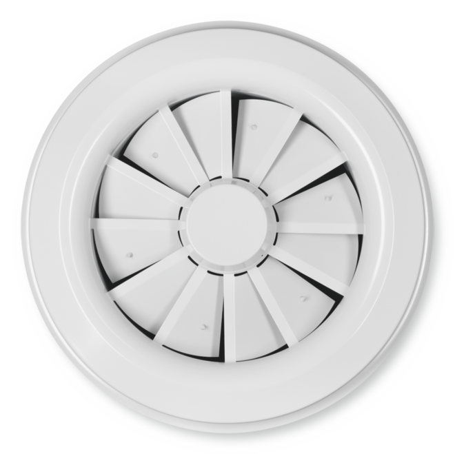 Circular ceiling swirl diffusers, with manual or motorised adjustment of the air pattern to ensure draught-free ventilation of the occupied zone both in heating and cooling modes