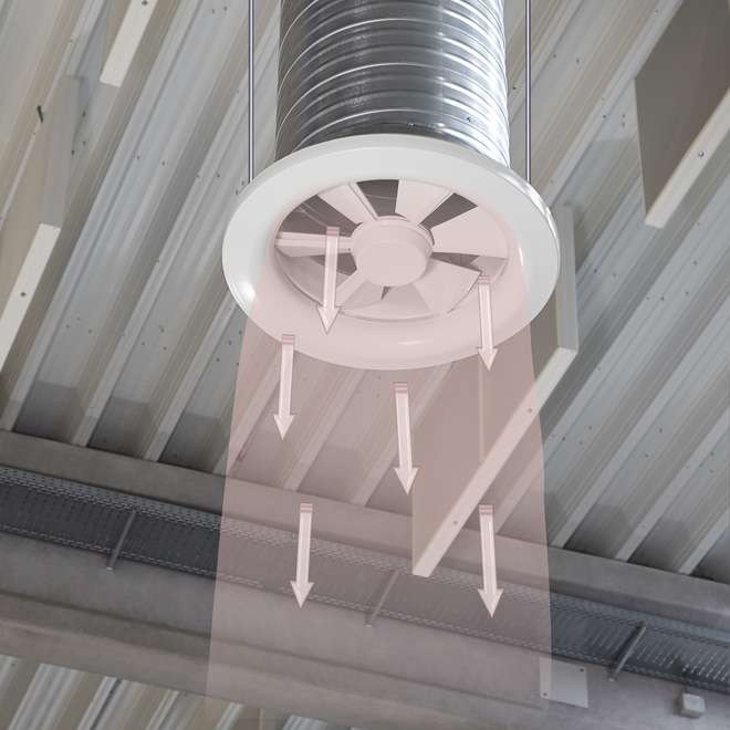 • The efficient swirl creates high induction levels, thereby rapidly reducing the temperature difference and airflow velocity