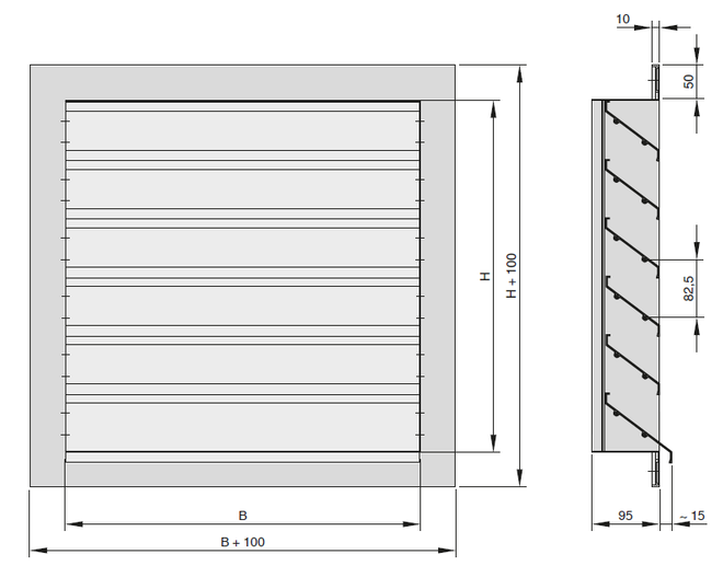• Frontrahmen, Trennsteg und Lamellen aus profiliertem, verzinktem Stahlblech, Aluminium oder Edelstahl