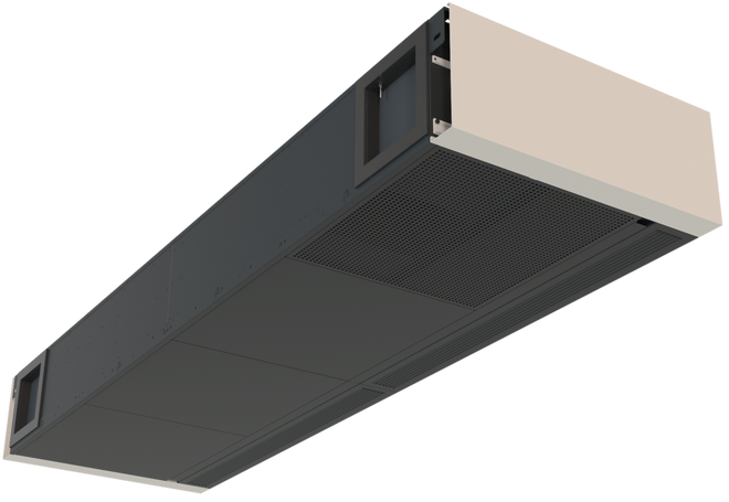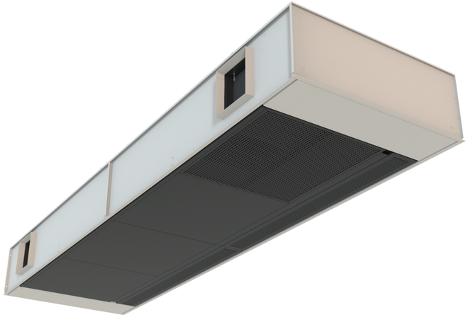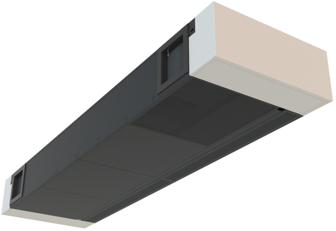 Deckenlüftungsgerät TROX X-CUBE/SCHOOLAIR-D-HV-0-2 mit Zu- und Abluftfunktion, Rotationswärmerückgewinner und Umschaltmöglichkeit auf Sekundärluftbetrieb (luftqualitätsabhängig) sowie Wärmeübertrager zum Einbau im Deckenbereich: